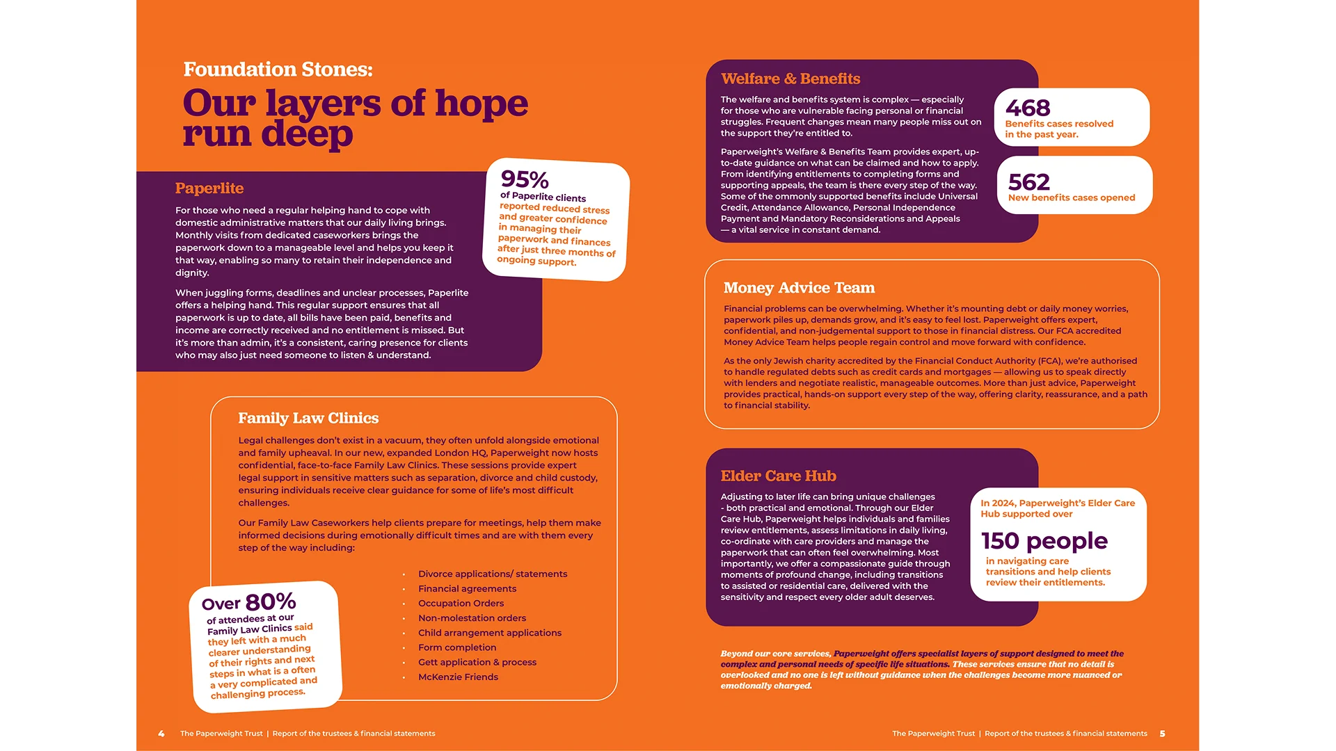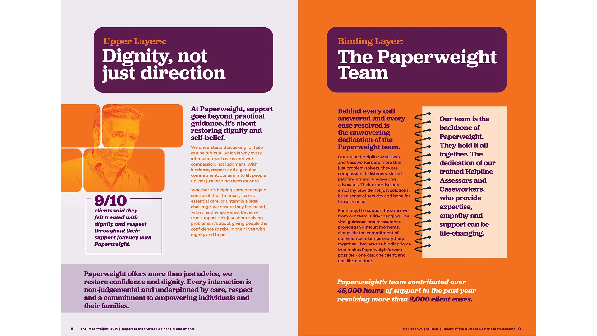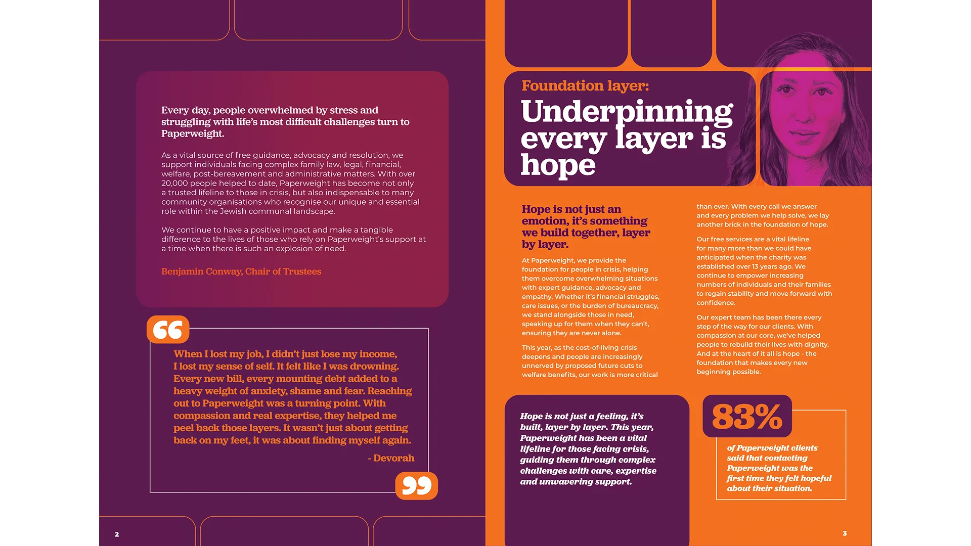 Together, we developed the concept “Underpinning Every Layer is Hope”. This became the creative framework that shaped both the design and structure of the report. Each section represented a different “layer” of Paperweight’s support — from legal help to family guidance to financial stability — building towards the shared foundation of hope.