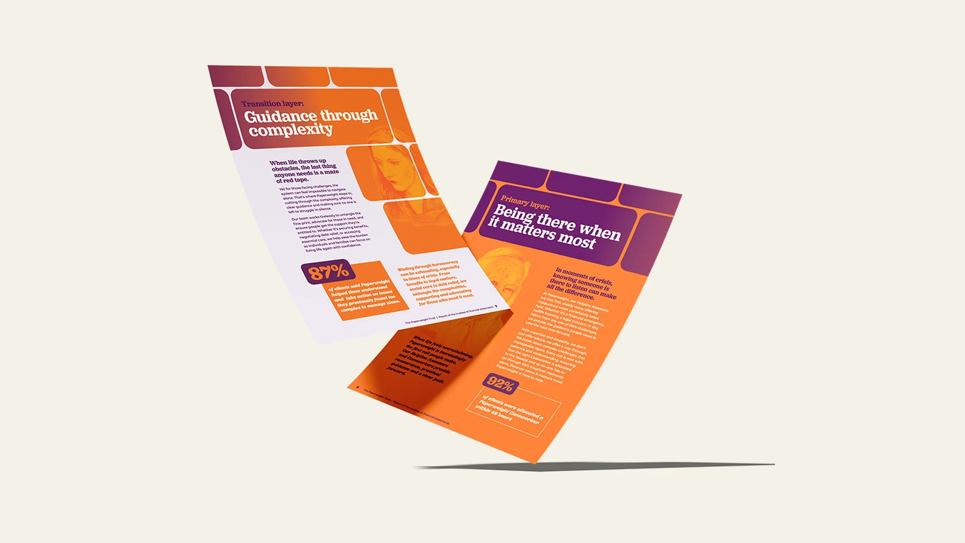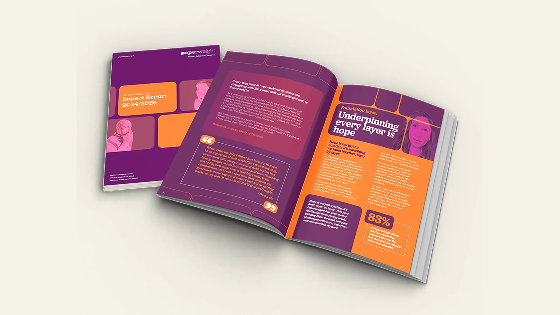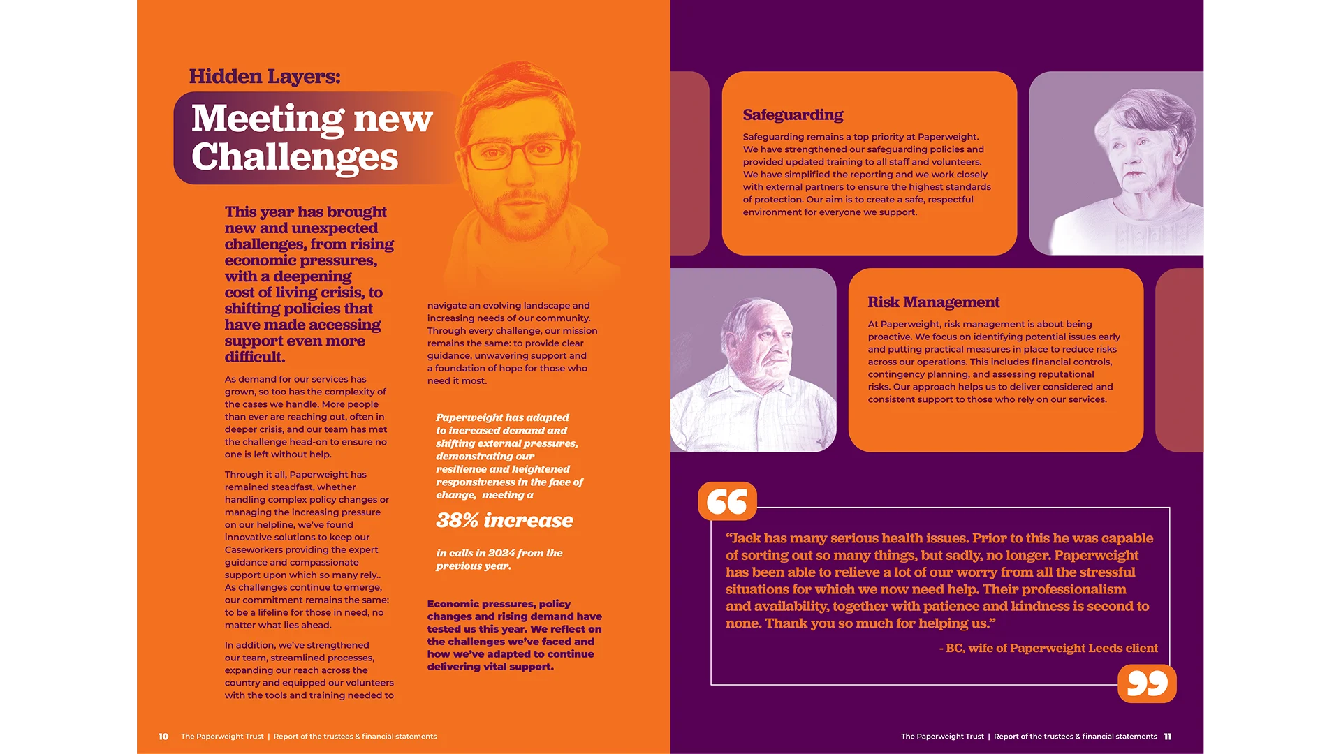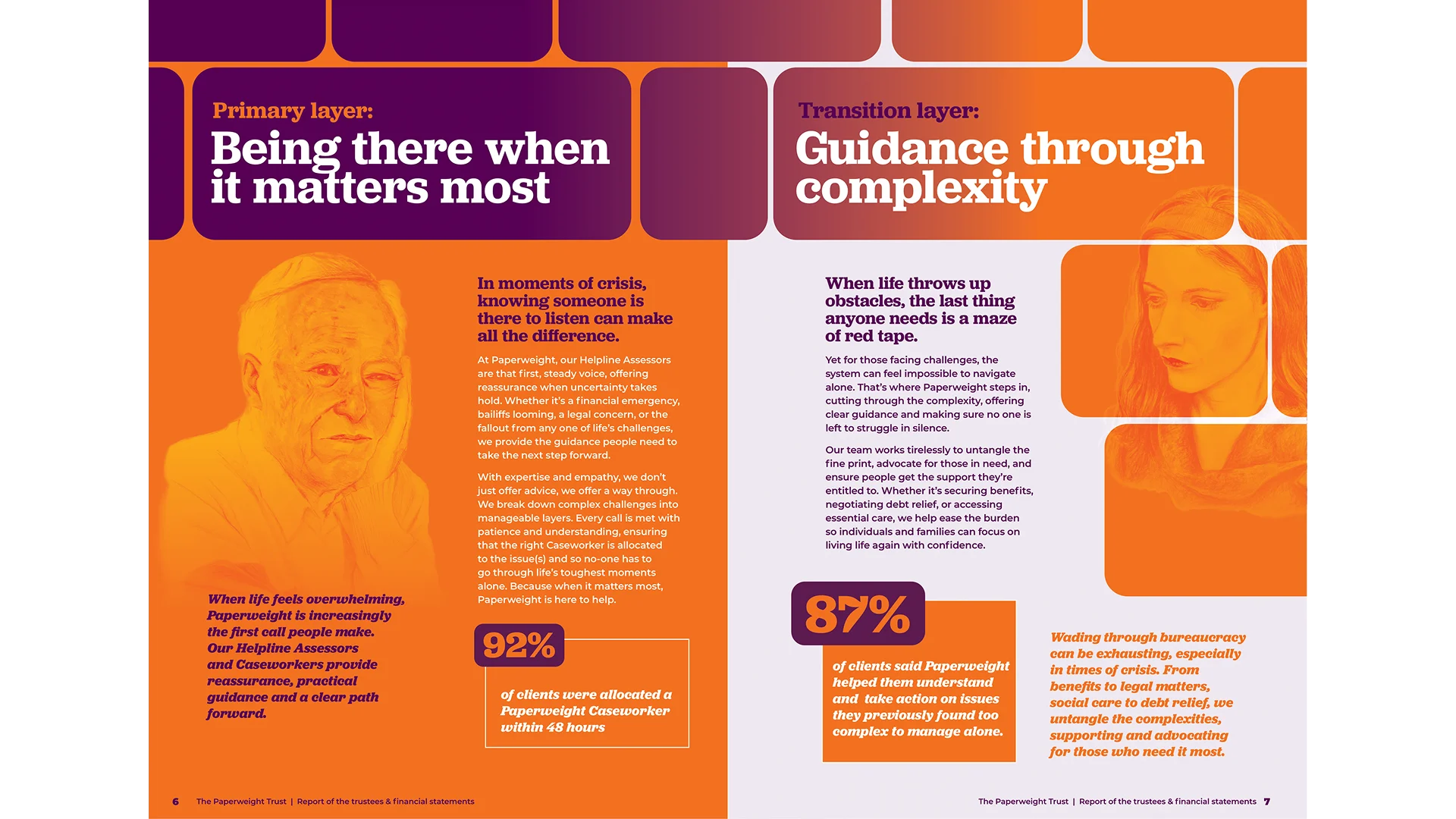 Together, we developed the concept “Underpinning Every Layer is Hope”. This became the creative framework that shaped both the design and structure of the report. Each section represented a different “layer” of Paperweight’s support — from legal help to family guidance to financial stability — building towards the shared foundation of hope.